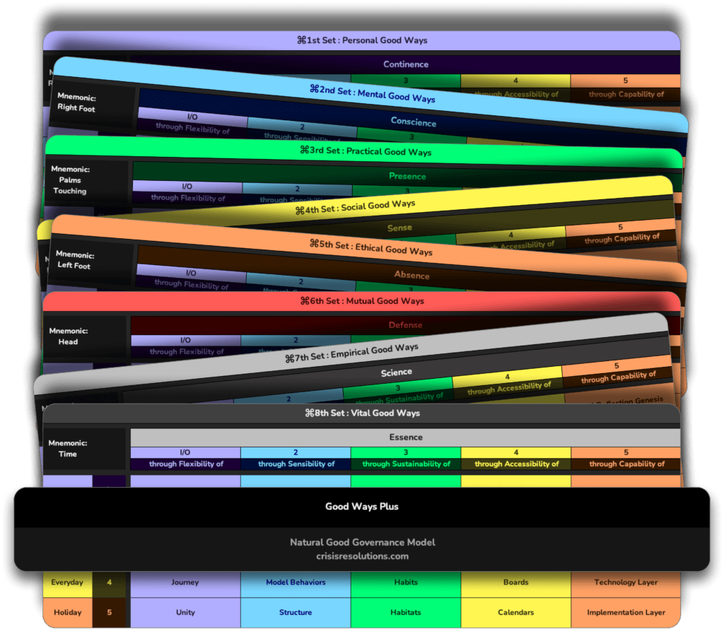 Just as a color palette provides a comprehensive range of colors for an artist to use, the Good Ways Model, on its Plus Edition (Full), provide a comprehensive mapping of all types of good ways, allowing individuals to fully explore the crisis of each possibility. Within these Sets, there are 8 Standard ways that serve as a foundation, and an additional 205 Dependent ways that build off of these Standards, providing a rich and varied landscape of possibilities to explore.